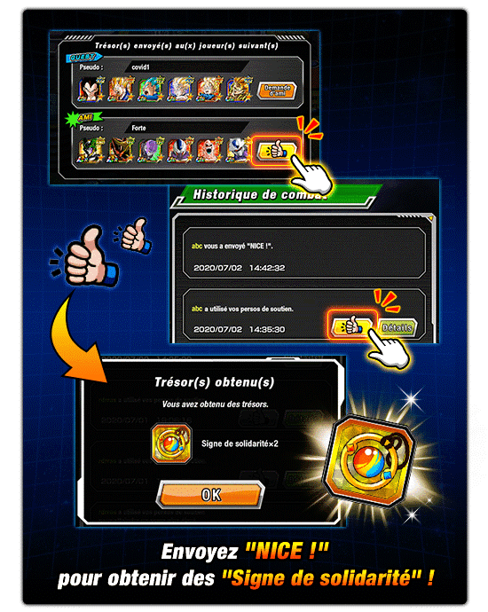 Après avoir envoyé NICE ! , l’expéditeur et le destinataire pourront tous les deux recevoir le trésor Signe de solidarité , alors tentez d’envoyer NICE ! après chaque bataille !