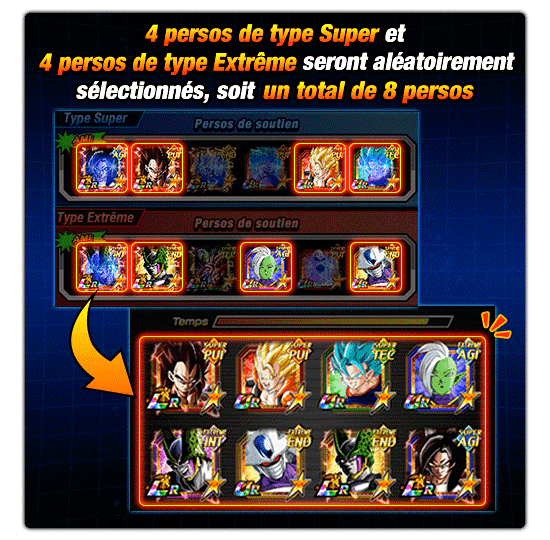3. Choisissez les persos de soutien et les persos de lien Vous pourrez ensuite choisir les Persos de soutien de type Super et de type Extrême à emprunter parmi les Persos de soutien à prêter définis par vos amis ou des guests !