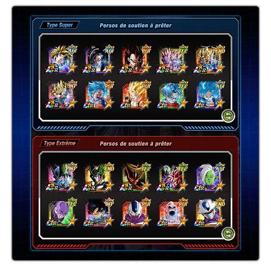 3. Choisissez les persos de soutien et les persos de lien Vous pourrez ensuite choisir les Persos de soutien de type Super et de type Extrême à emprunter parmi les Persos de soutien à prêter définis par vos amis ou des guests !