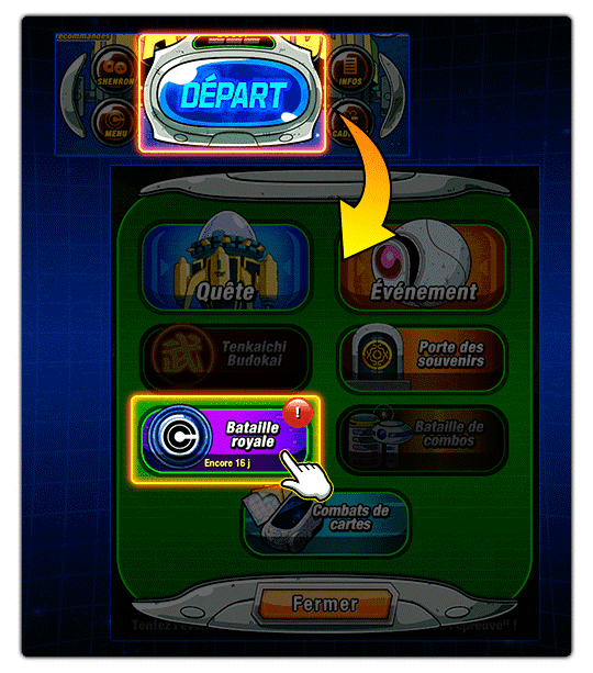 Seuls les joueurs du Rang 150 ou des rangs supérieurs peuvent participer à cet événement ! Appuyez sur l’icône DÉPART de la page d’accueil et l’icône de la bataille royale apparaîtra !