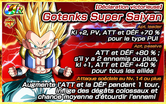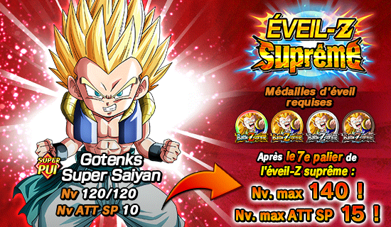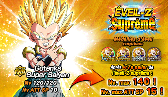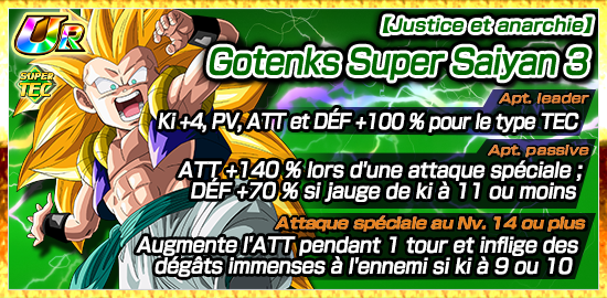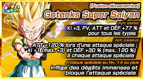 De plus,  [Foi en la super fusion] Gotenks Super Saiyan pourra utiliser l’éveil Dokkan pour devenir [Fusion dévastatrice] Gotenks Super Saiyan .