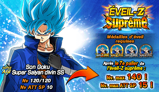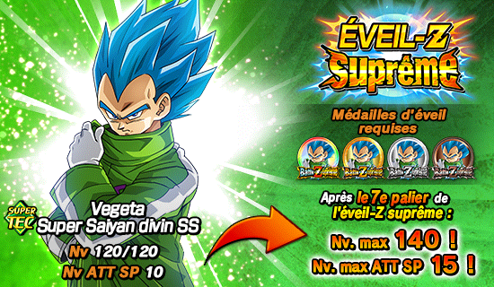 En outre, [Dieu en colère] Son Goku Super Saiyan divin SS et [Libération de la puissance divine] Vegeta Super Saiyan divin SS pourront utiliser les médailles d’éveil obtenues dans cet événement pour provoquer leur éveil-Z suprême !
