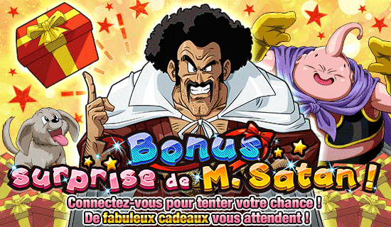 Obtenez une fois par jour un super cadeau faisant partie d’une des 3 catégories Chanceux ! , Super chanceux ! et Ultra super chanceux ! offert par M. Satan pendant la période de l’événement !