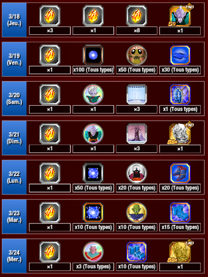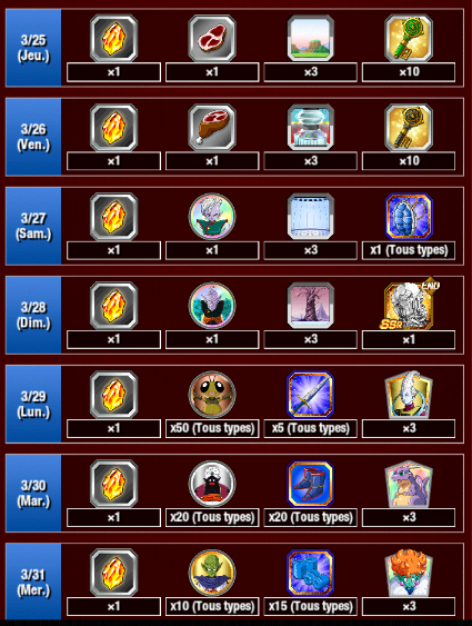 En vous connectant au jeu tous les jours, en plus d’obtenir des Viandes maturées, des médailles d’éveil, des sphères de potentiel et d’autres récompenses, vous pourrez aussi obtenir jusqu’à 26 Pierres Dragon !
