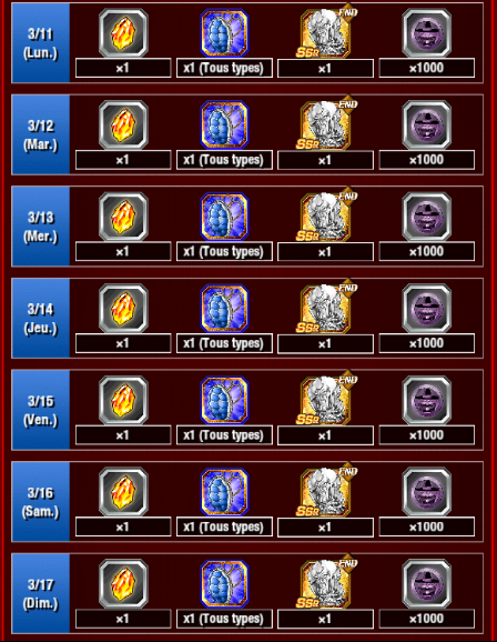Connectez-vous tous les jours pour obtenir de fabuleuses récompenses telles que des « Pierre Dragon », « Carapace de tortue (platine) » de chaque type, des « Point d’échange » et des « Statue de M. Satan (platine) » !