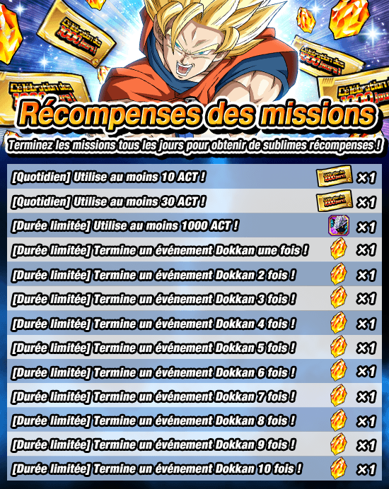 * Une fois que l’événement Festival Dokkan « Célébration des 1000 jours » prend fin, les tickets d’invocation « Ticket de célébration » non-utilisés pendant la période de l’événement ne seront plus valables. Veillez à les utiliser avant la date limite.