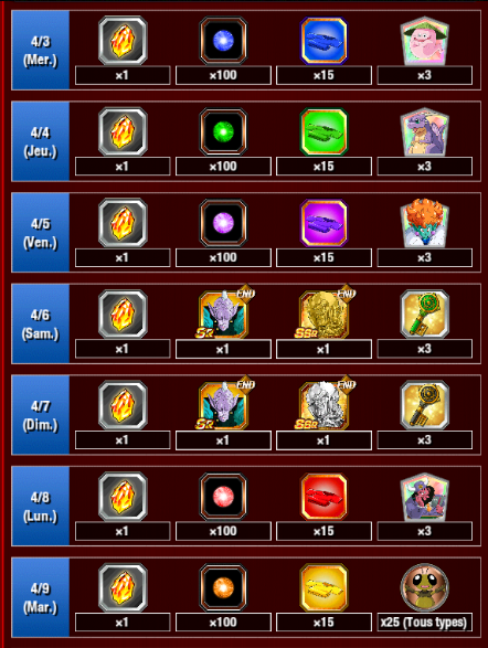 * Le bonus de connexion quotidien sera distribué progressivement toutes les 10 minutes en fonction du dernier chiffre de votre ID d’utilisateur. La distribution de ce bonus commencera à partir de 16:00 PST et les ID utilisateurs des joueurs dont le dernier chiffre est le plus petit le recevront en premier.