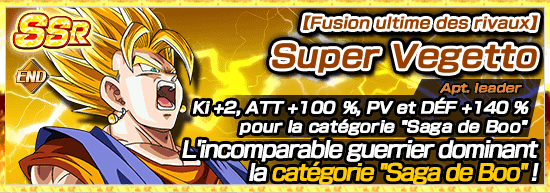 Super Vegetto peut non seulement utiliser son aptitude leader pour renforcer les personnages de la catégorie « Saga de Boo », mais il peut aussi réduire les dégâts encaissés des attaques normales et lancer une contre-attaque avec son aptitude passive !