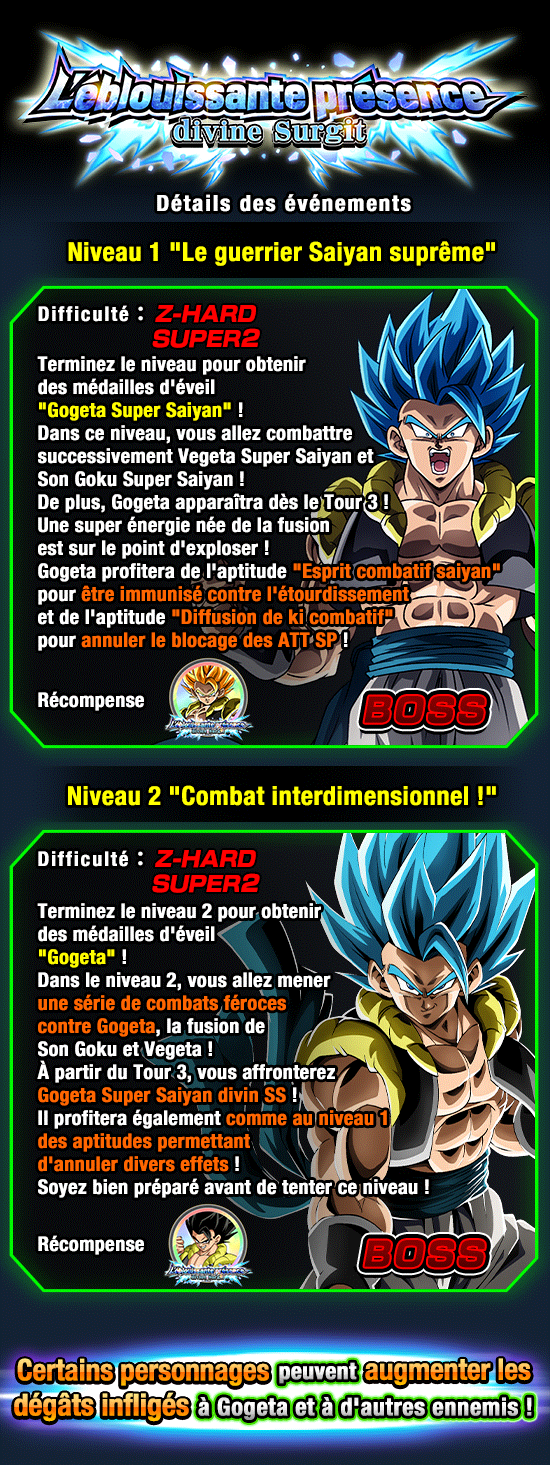Vegeta Super Saiyan, Son Goku Super Saiyan et Gogeta Super Saiyan apparaissant dans cet événement en tant qu’ennemis possèdent tous une aptitude de réduction des dégâts encaissés !