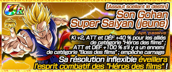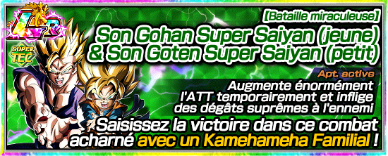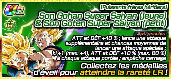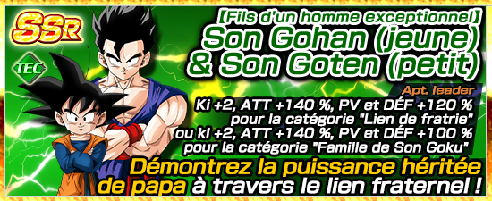 Son Gohan (jeune) & Son Goten (petit) ayant hérité d’une puissance incroyable de leur père, possède une aptitude leader extraordinaire qui renforce considérablement les personnages de catégorie « Lien de fratrie » ou « Famille de Son Goku » !