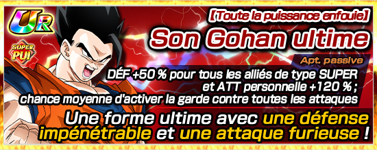 L’aptitude leader de Son Gohan ultime SSR augmente la puissance des personnages de la catégorie « Saiyan de sang-mêlé » !
