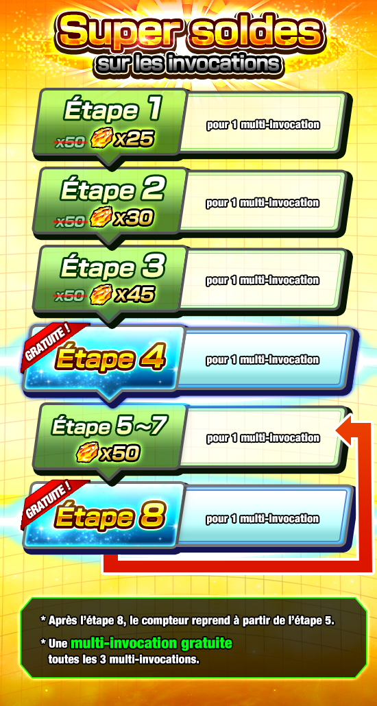 Par exemple, effectuer deux multi-invocations dans le Festival Dokkan Super et une multi-invocation dans le Festival Dokkan Extrême ne vous permettra pas d’obtenir une multi-invocation gratuite.