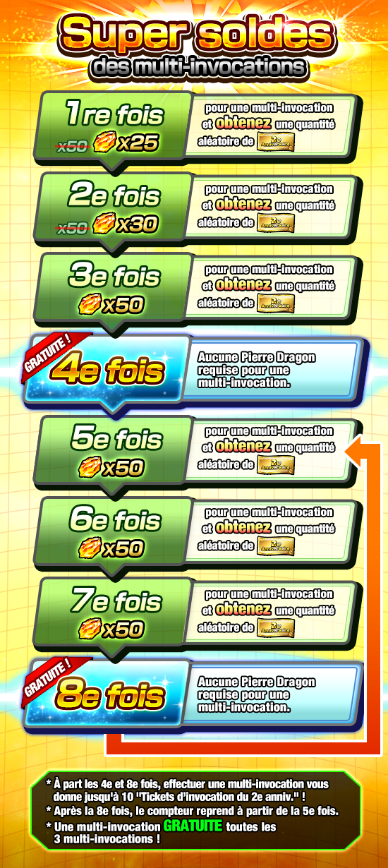 Par exemple, effectuer deux multi-invocations dans le festival Dokkan de Son Goku Super Saiyan 4 et une multi-invocation dans le festival Dokkan de Vegeta Super Saiyan 4 ne vous permet pas d’obtenir une multi-invocation gratuite.