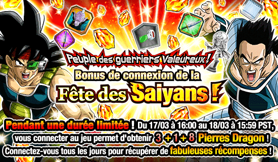 Afin de célébrer la « Fête des Saiyans », connectez-vous pendant la période du 17/03 (mar.) à 16:00 au 18/03 (mer.) jusqu’à 15:59 PST pour recevoir 3 + 1 + 8 Pierres Dragon !
