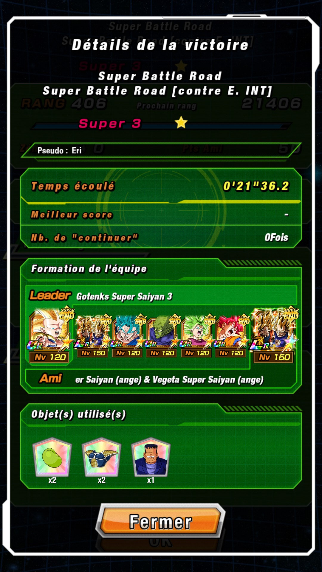 21 juillet 2018 à 13 h 20 min #6095821 juillet 2018 à 14 h 34 min #60960@Lutecefalco : bravo pour le Super END 🙂 Pour le Super AGI, je pense que ce ne sera pas faisable pour le moment malgré la présence du Gotenks LR, Vegeta SSJ4 est vraiment indispensable selon moi pour le tank, et évidemment le plus gros bonus à l’équipe.