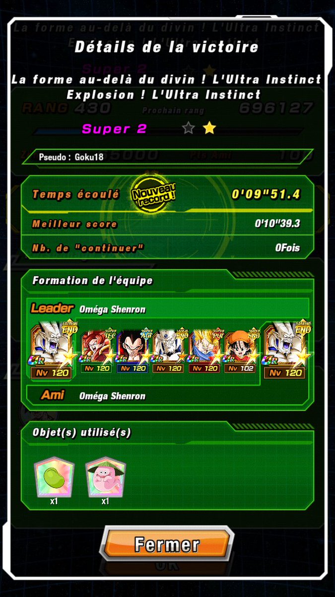 Je vais farmer mes 77 médailles, et ensuite tenter d’autres équipes pour voir avec quoi on peut passer. Peut-être que je tenterais la team Divine avec le Goku UI dokkan, à voir si la Saga Boo peut passer.