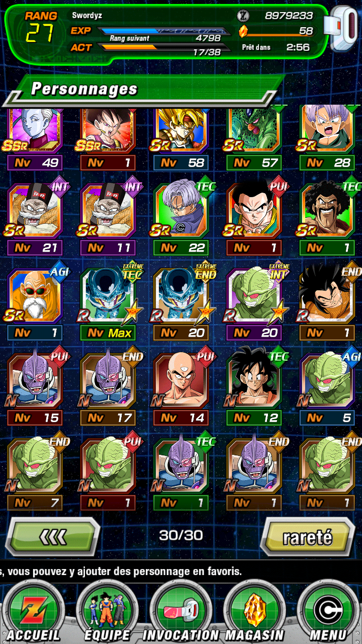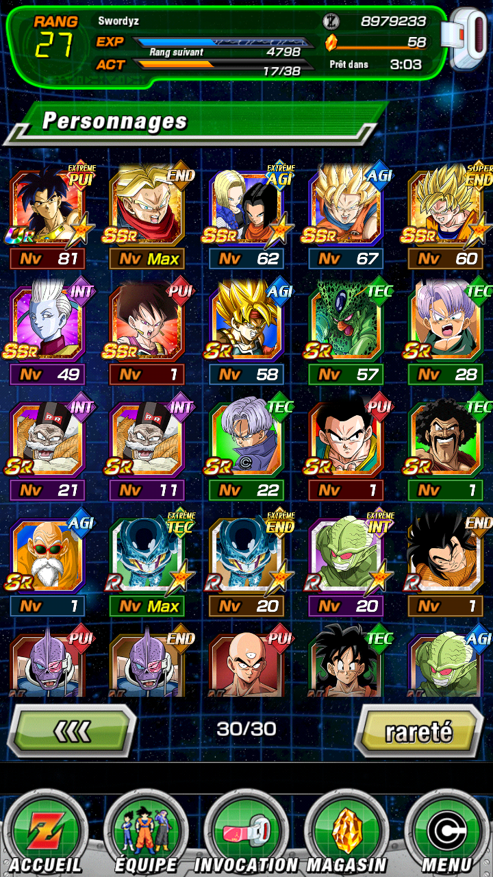 30 novembre 2017 à 16 h 52 min #46069Bonjour ou Bonsoir a tous. =) Je voudrais savoir si ces une bonne team et quelle event je peut faire avec. j’ai mit leader goku ssj4 ,omega shenron pui , golden freezer tec, gogeta int spe10 ,gotenk end, goku ssj3 gt pui. voici ma box pour d’autre suggestion pour d’autre team.