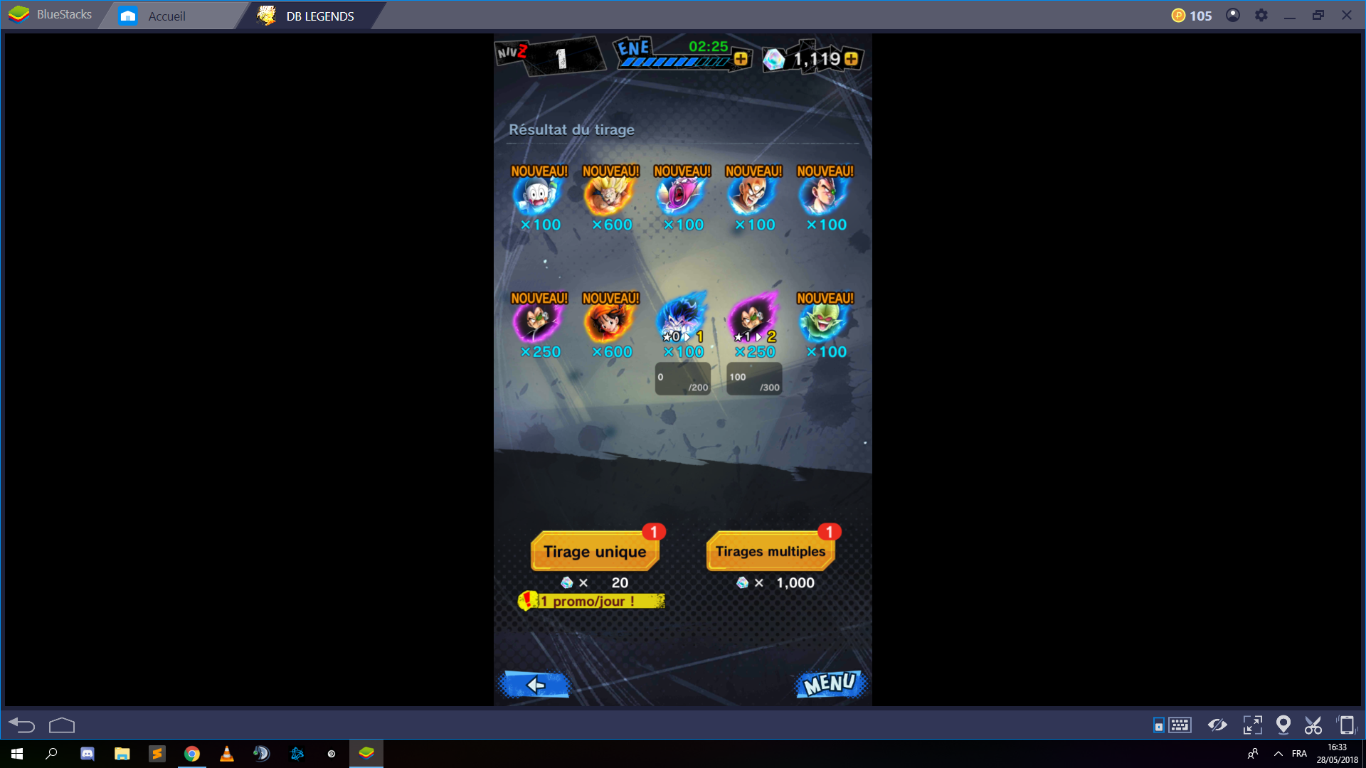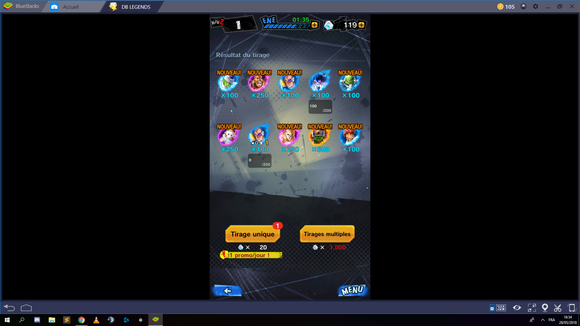 Au bout de 13 fois, j’en ai eu marre alors j’ai sorti l’ancien tel installé l’emulateur et j’ai reset, reset, reset, jusqu’à obtention, il m’aura quand même fallu 46 reset(soit 94 multi mdr) pour l’obtenir, et sur mes 2 tirages, j’ai été plutot chanceux