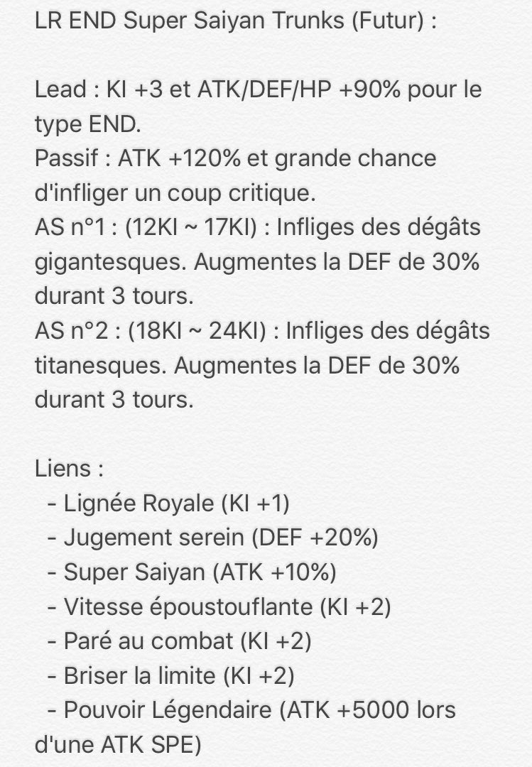 Hâte qu’un buuhan , ou un gohan ultime ai sa carte LR , la sa risque de déchirer20 septembre 2018 à 16 h 53 min #63402Grande question, sur ce perso vous privilégieriez quoi entre l’attaque sup et le critique? Sachant qu’il a déjà 50% de chance de base de partir en critique .