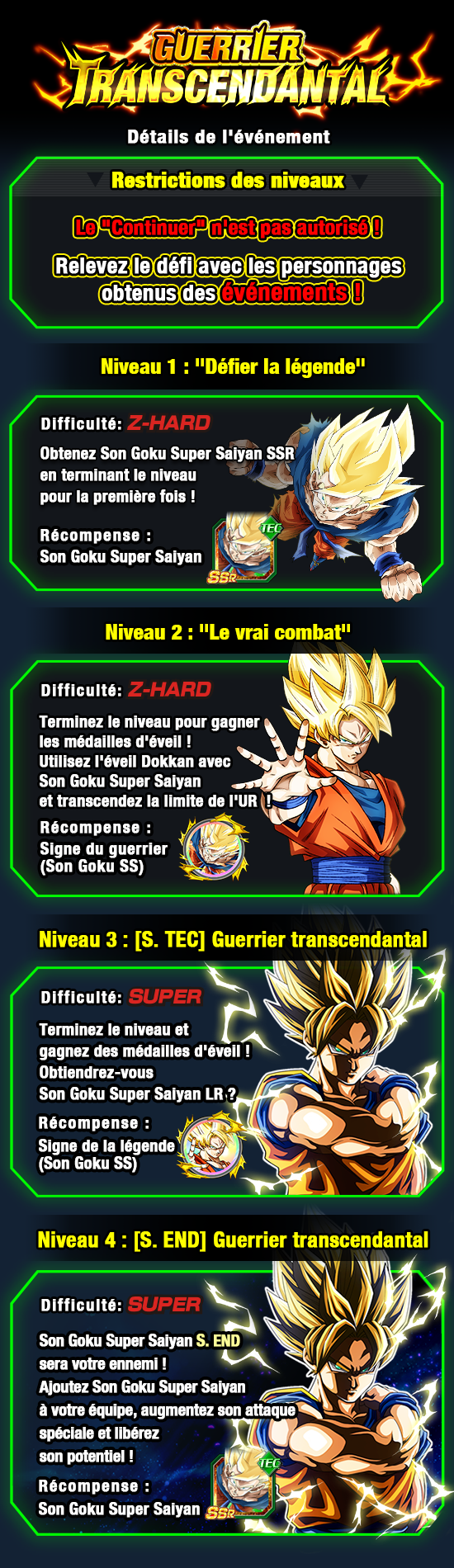 * Vous aurez de faibles chances d’obtenir [Rage sans limites] Son Goku Super Saiyan [SSR] dans le niveau 1 à partir de la deuxième fois que vous le compléterez.