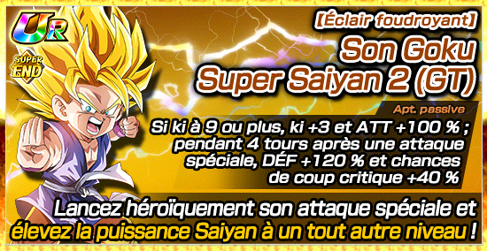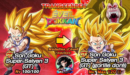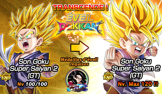 [Quintessence du Saiyan] Son Goku Super Saiyan 2 (GT) pourra utiliser l’éveil Dokkan grâce aux médailles d’éveil obtenues dans le niveau 2 pour devenir [Éclair foudroyant] Son Goku Super Saiyan 2 (GT) !