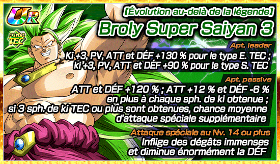 * Le personnage ci-dessus est la forme de [Évolution du désespoir] Broly Super Saiyan 3 disponible dans cette invocation, après avoir provoqué un éveil Dokkan puis un éveil-Z suprême.
