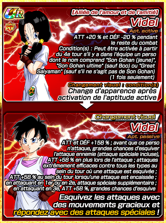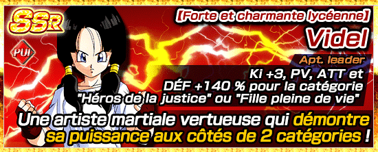 Videl peut renforcer les alliés des catégorie Héros de la justice et Fille pleine de vie avec son aptitude leader !