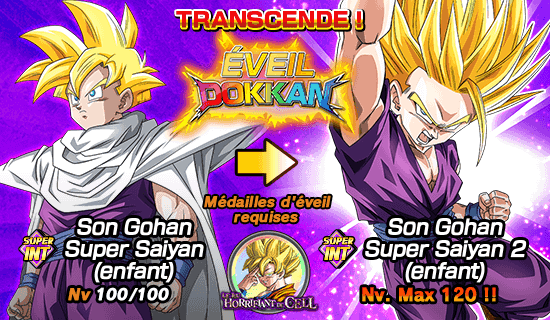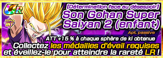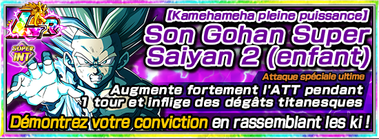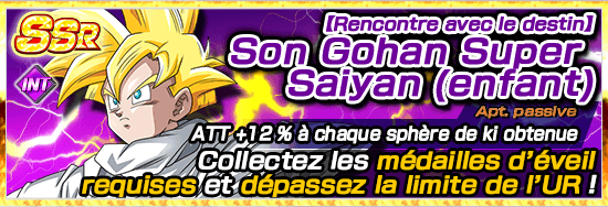 * Après avoir atteint la rareté LR grâce à l’éveil Dokkan, [Rencontre avec le destin] Son Gohan Super Saiyan (enfant) deviendra [Kamehameha pleine puissance] Son Gohan Super Saiyan 2 (enfant).