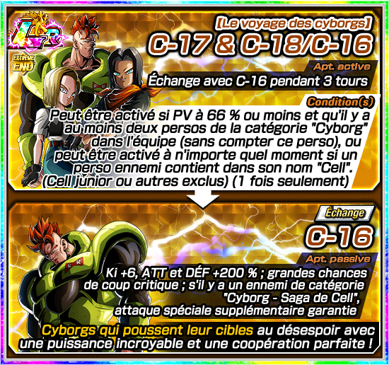 Après avoir atteint la rareté LR grâce à l’éveil Dokkan, « C-17 et C-18 » pourra utiliser son aptitude active pour échanger avec C-16 pendant 3 tours !