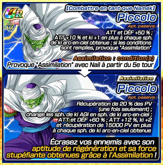Après l’éveil Dokkan, Piccolo possédera une aptitude « Assimilation » qui lui permet d’obtenir une force encore plus puissante une fois les conditions remplies lors du combat !