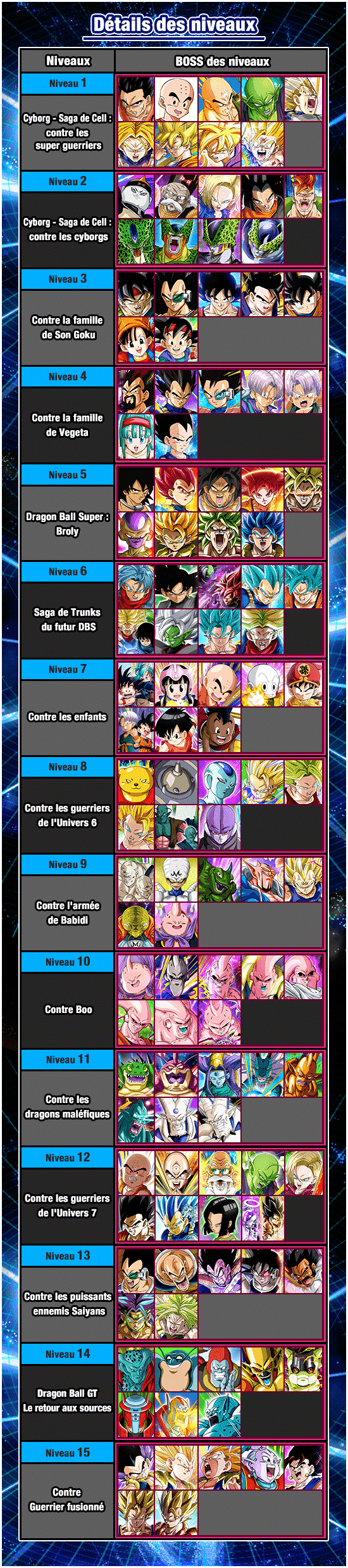 Niveau 5 : Gogeta Super Saiyan divin SS Niveau 6 : Vegetto Super Saiyan divin SS Niveau 8 : Hit Niveau 12 : Son Goku & Freezer (forme finale) (ange) Niveau 15 : Super Vegetto, Super Gogeta