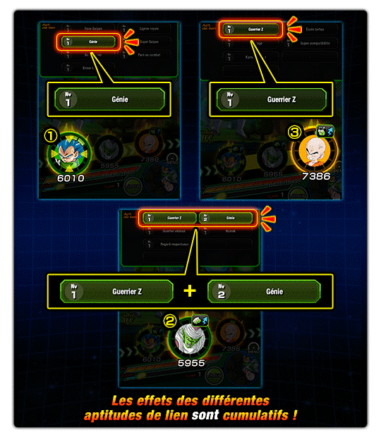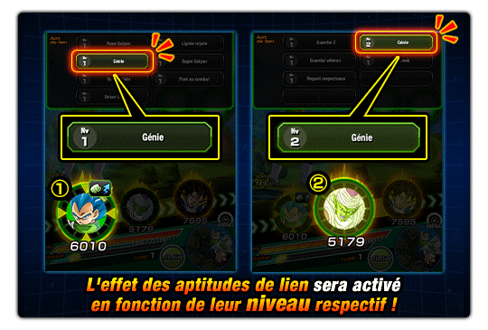 L’apt. de lien de Vegeta Super Saiyan divin SS « Génie » est de niveau 1 et la même apt. de lien de Piccolo est de niveau 2.