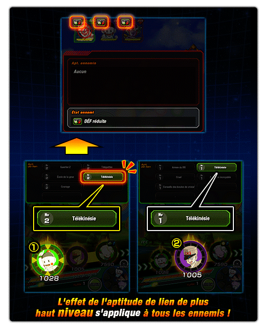 Si Chaozu et Commandant Blue activent l’apt. de lien « Télékinésie », qui est une apt. qui réduit la DÉF de l’ennemi, seul l’effet provenant de Chaozu sera appliqué, puisque son niveau d’aptitude est plus haut.