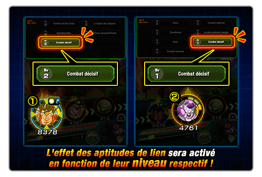 L’apt. de lien de Son Goku (Kaioken) « Combat décisif » est de niveau 2 et la même apt. de lien de Freezer (pleine puissance) est de niveau 1.