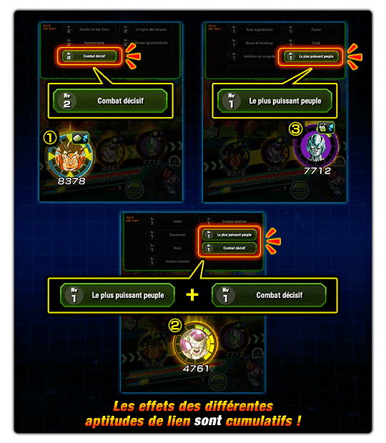 « Combat décisif » et « Le plus puissant peuple » ont des noms différents, les 2 apt. de lien seront donc appliquées sur Freezer (pleine puissance).