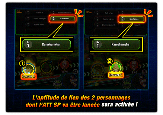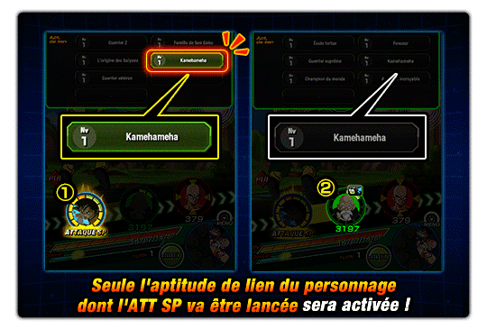 Son Goku et Kamesennin vont lancer une ATT SP ce tour-ci, l’apt. de lien « Kamehameha » appliquera donc ses effets sur les deux personnages.