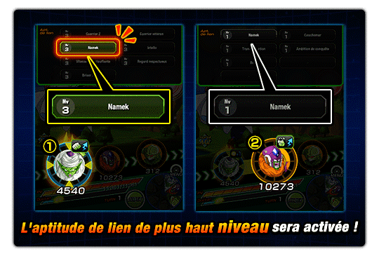 Si Piccolo et Slug activent l’apt. de lien « Namek », qui est une apt. qui régénère les PV, seul l’effet provenant de Piccolo sera appliqué, puisque son niveau d’aptitude est plus haut.
