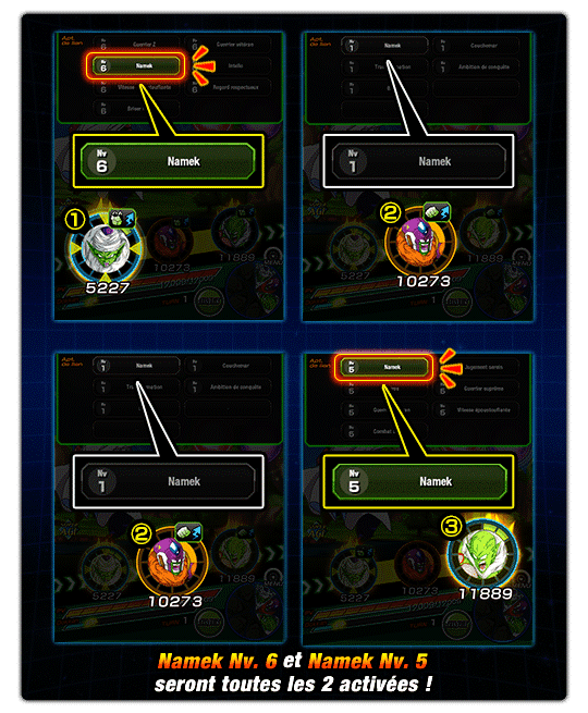 La première activation de « Namek » sera basée sur le niveau de Piccolo avec des effets de niveau 6.