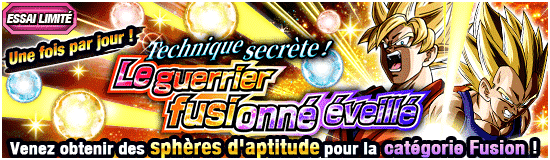 Un événement limité à un essai par jour qui vous permet d’obtenir des sphères d’aptitude exclusives aux personnages de la catégorie Fusion !