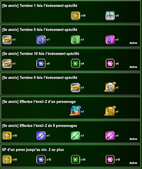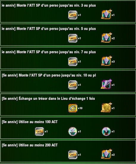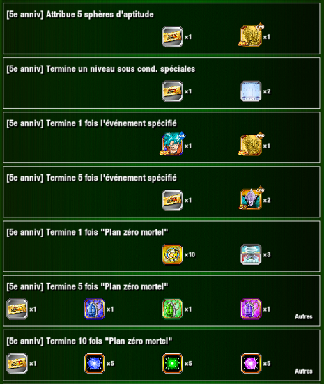 * Veuillez noter que concernant la mission « [5e anniv] Termine 5 fois l’événement spécifié » (pour laquelle vous devrez terminer 5 fois l’événement « Entraînement intense de niveau divin »), vous ne pourrez tenter le niveau qu’une fois par jour. Il est donc possible qu’en fonction de vos essais vous ne puissiez pas obtenir toutes les récompenses, telles que « Ticket d’invocation multiple 55 » ou autres.