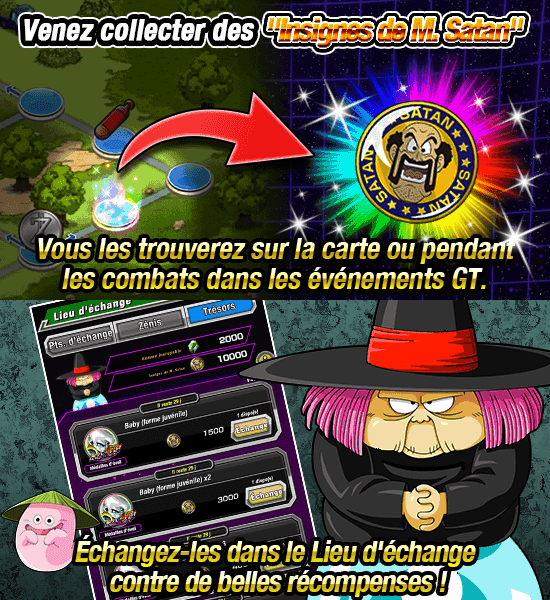 * Après la fin de cet événement, les insignes de M. Satan restants que vous possédez seront conservés pour la prochaine édition de cet événement.
