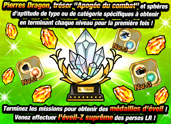 Des sphères d’aptitude de chaque type et de certaines catégories ainsi que les médailles d’éveil requises pour l’éveil-Z suprême de [Le plus courageux !] Son Goku LR et [Grand héros] Son Gohan (petit) LR peuvent être obtenues via les missions !