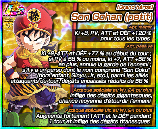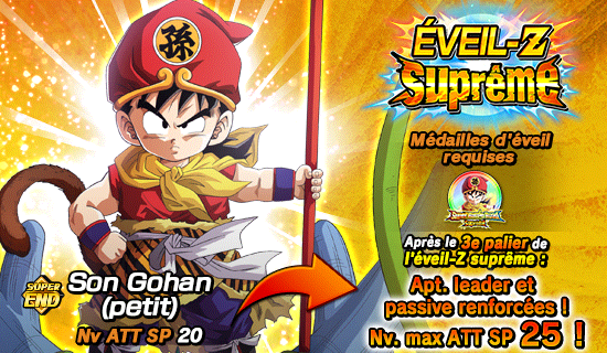En outre, [Grand héros] Son Gohan (petit), pouvant être obtenu via les missions de la « Super Battle Road », pourra effectuer l’éveil-Z suprême avec les médailles d’éveil obtenues dans cet événement !
