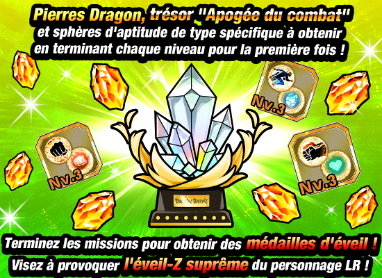* Les objets comme le trésor « Apogée du combat » et les Pierres Dragon ne peuvent être obtenus en tant que récompenses des missions que pour la première réussite de chaque niveau.