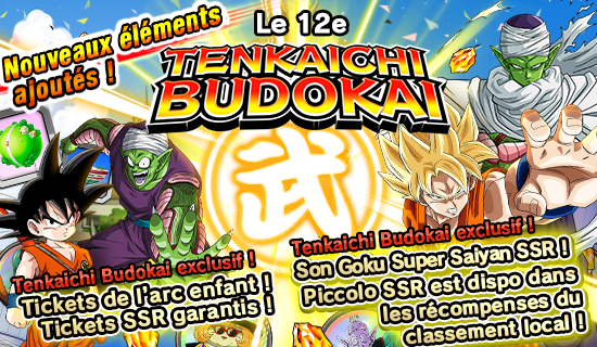 Contrairement à la compétition mondiale précédente vous permettant de rivaliser avec tous les joueurs pour atteindre un haut classement, vous pouvez désormais combattre avec 299 joueurs seulement dans le classement local du 12e Tenkaichi Budokai. Les joueurs qui atteignent les meilleures places du classement local pourront obtenir des récompenses spéciales ! Battez vos adversaires et démarquez-vous de vos concurrents !