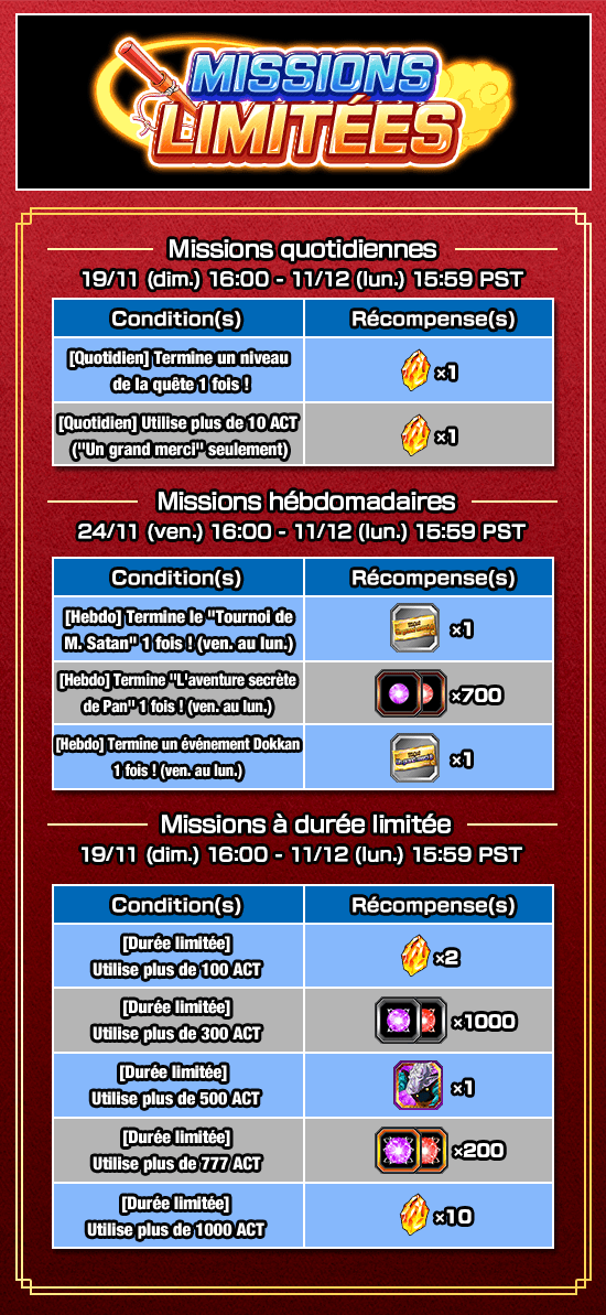 * Attention : les horaires des événements de Dokkan Battle sont indiqués à l’heure d’hiver (PST) et non d’été (PDT).