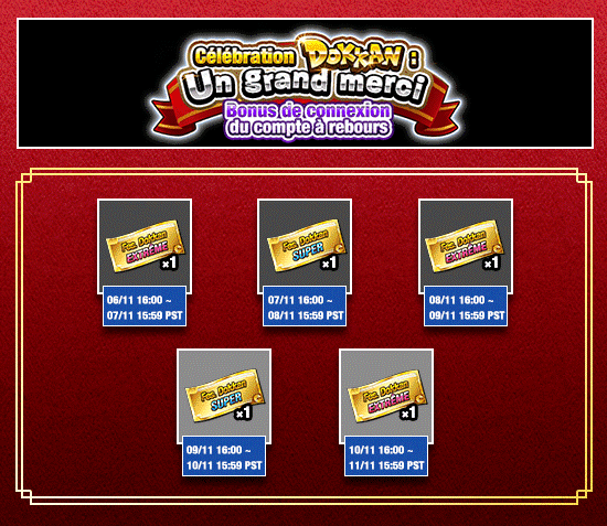 Connectez-vous tous les jours pendant la période de l’événement pour obtenir des « Ticket « Fes. Dokkan Super » » et des « Ticket « Fes. Dokkan Extrême » « , utilisables dans « Festival Dokkan x2 : invocation avec tickets » !